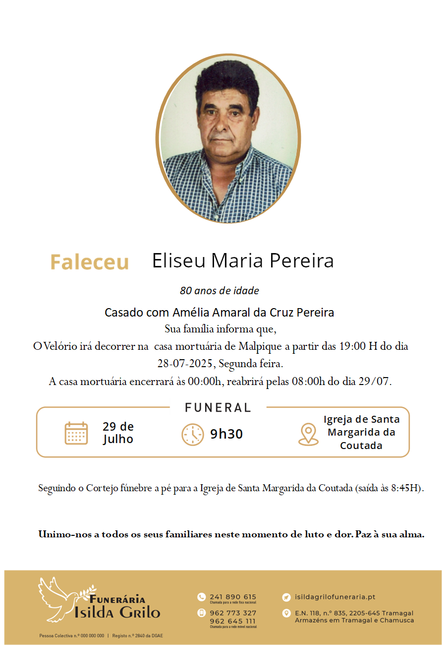 Velório: Casa Mortuária de Malpique, a partir das 19:00H do dia 28-07-2025