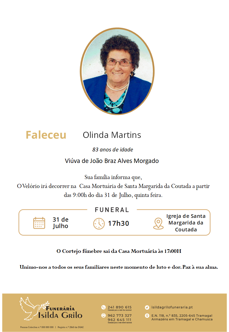 Velório: Casa Mortuária de Santa Margarida da Coutada, a partir das 9:00H do dia 31-07-2025